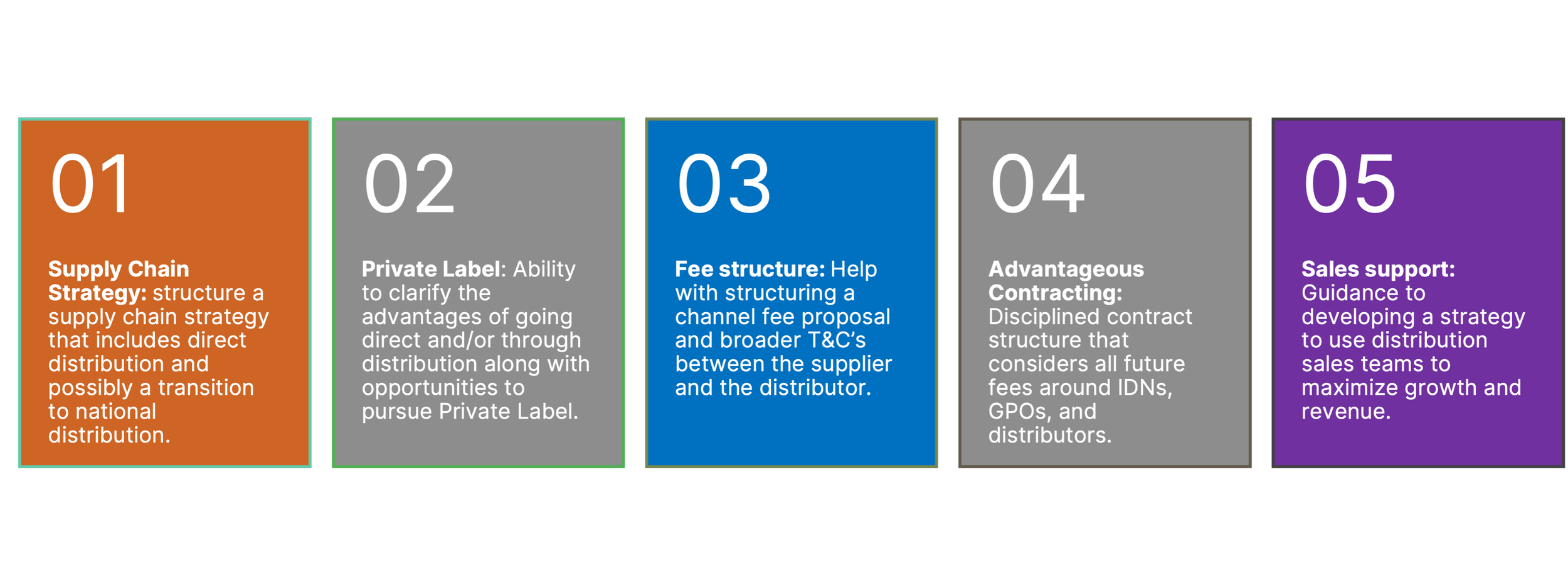 Advise on private label strategies and programs offered by major distributors, leveraging our experience with leading GPOs to help create pathways to contract access and accelerate sales adoption